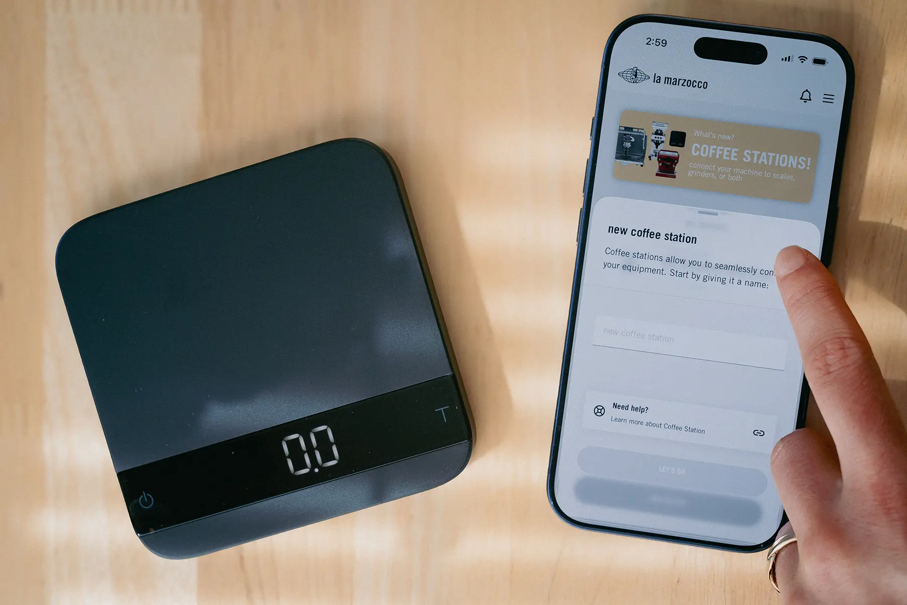 (1) Open the La Marzocco app. Check for updates, you will need v1.7.0 or later. Navigate to your coffee station and add your Acaia Lunar scale.