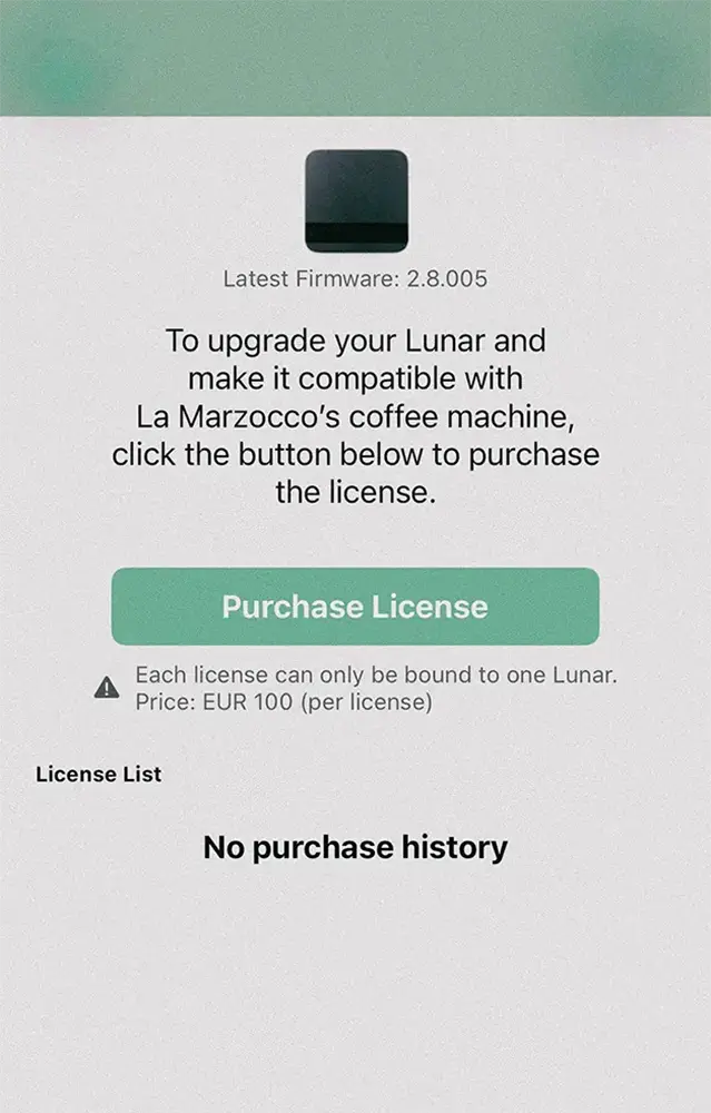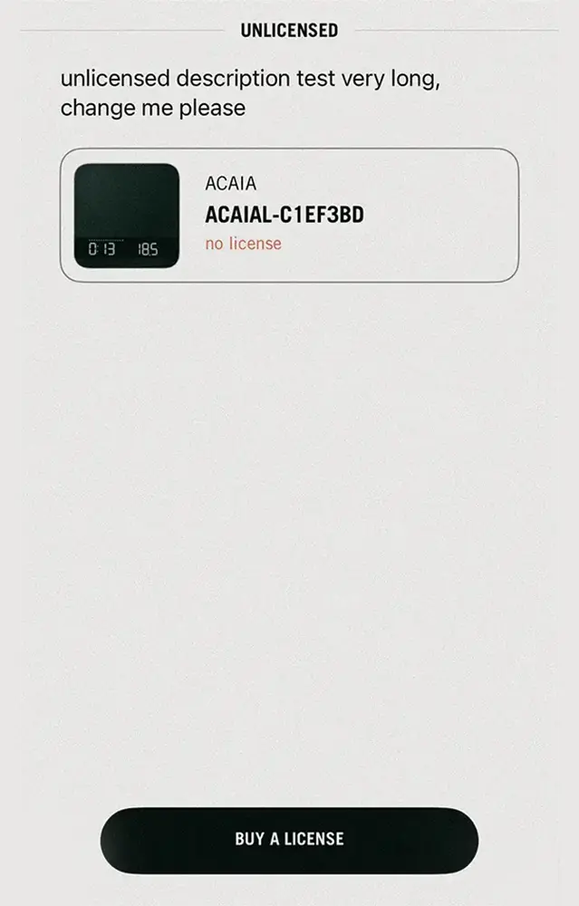 (2) The app will detect the Acaia Lunar and prompt you to purchase the upgrade license.